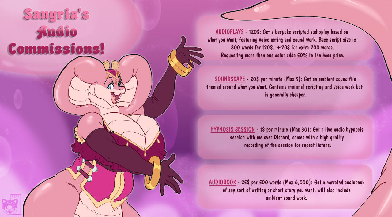 Im just a big pink bubblegum snake that likes to make people feel good with the power of audio and my voice! In actuality I'm a recreational hypnotist, audio engineer, editor and voice actress and I can work for you!
